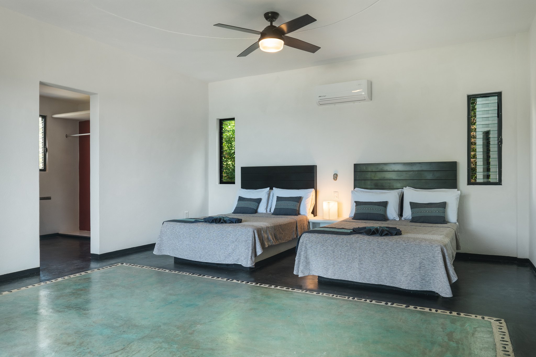 “The Superior Room offers a generous space, including a large private terrace perfect for unwinding. Designed in a modern, minimalistic style, this room combines elegance with comfort. It features a spacious dressing room and a comfortable bathroom with stunning ocean views. With two double beds, it comfortably accommodates up to four guests, making it ideal for families or friends traveling together. The highlight is the terrace hammock — a perfect spot to relax and soak in the vibrant sunsets over the Pacific. This suite is a stylish retreat for those seeking space, comfort, and breathtaking coastal views.”